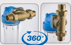 Větší filtr SENIOR 10" řady DP DS 360° je revoluční univerzální novinka na trhu s filtry, která umožňuje instalaci na vodorovná i svislá potrubí. Není tak nutné pracné předělávání svislého rozvodu a vsazování klasického filtru. Filtr je vybaven univerzální hlavou pro použití filtračních patron typu BX i SX, která dává uživateli možnost širšího výběru. Instalace filtru je možná bez použití držáku. Filtr je nesen samotným vodovodním potrubím.