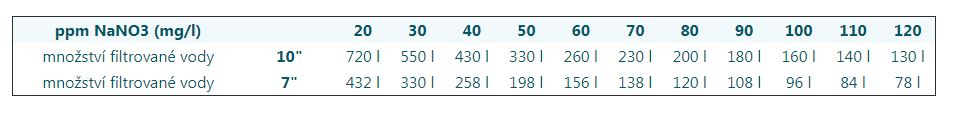 Celkové množství vody, které dokáže kartuše přefiltrovat, závisí na výchozí koncentraci dusičnanů (mg/l) ve vaší vodě: