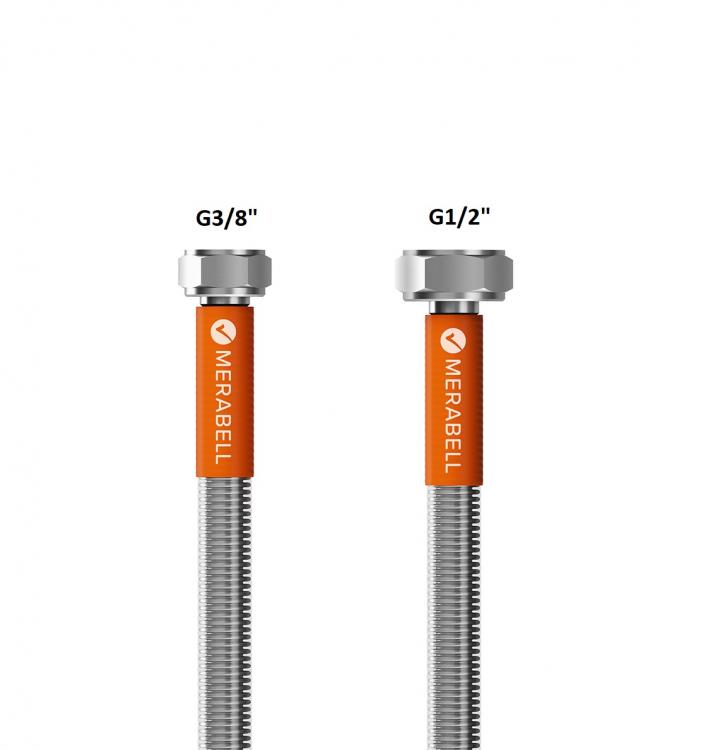 Nerezová přívodní flexi hadice k WC MERABELL Aqua Profi G3/8" – G1/2" (35 cm) je na jedné straně opatřena otočnou maticí se standardním závitem G3/8" a na straně druhé maticí se závitem G1/2". Před pořízením přívodní hadice proto zkontrolujte velikost obou šroubení vaší stávající hadice k WC!